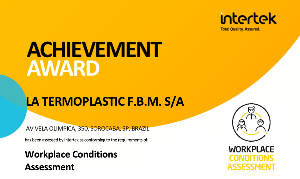 A La Termoplastic F.B.M. Brasil acaba de conquistar 98% de conformidade na auditoria WCA (Workplace Conditions Assessment), realizada pela Intertek. Essa avaliação internacional reconhece empresas que adotam boas práticas em condições de trabalho, saúde e segurança, meio ambiente, gestão de negócios e ética corporativa.